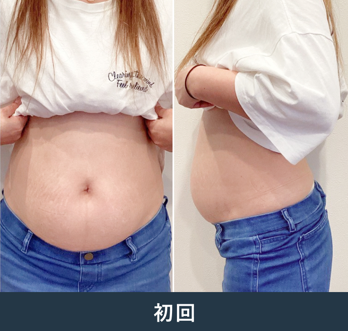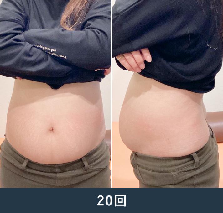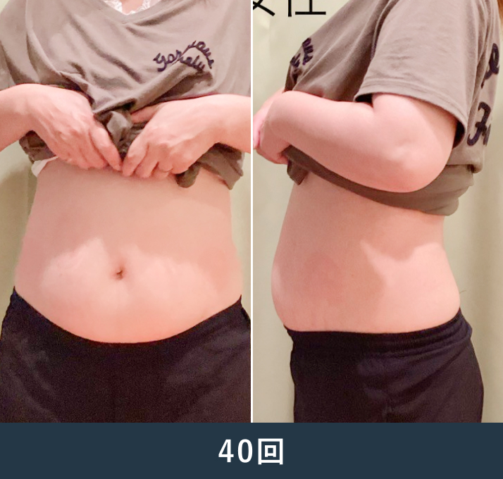 体重がなかなか落ちないことと便秘にお悩みだったため、本メニューを提案しました。施術を通じて「便秘が改善した」という体調の変化を実感され、40回の長期コースを継続していただきました。硬かったお腹の脂肪も徐々に剥がれて柔らかくなり、見た目もスッキリと変化しました。