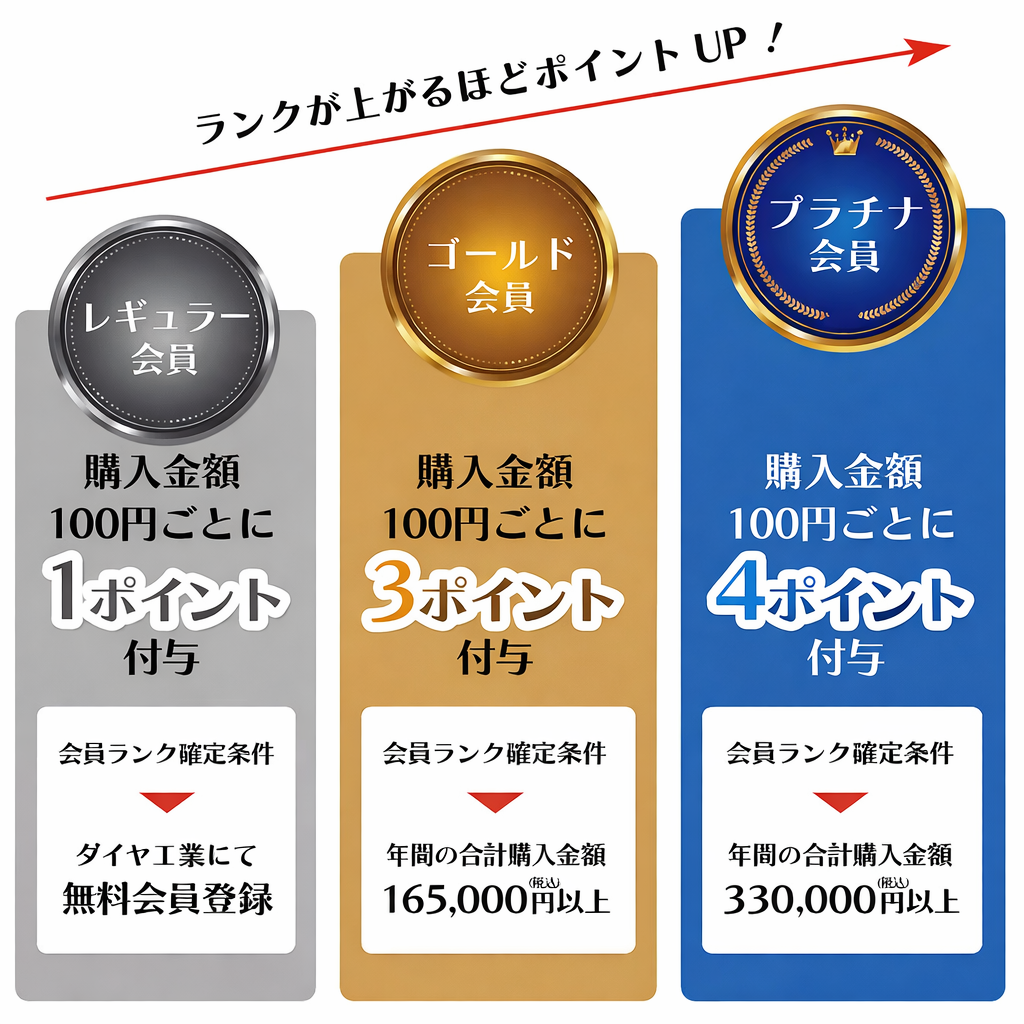 レギュラー会員では100円ごとに1ポイント付与ですが、ゴールド会員だと100円ごとに3ポイント、プラチナ会員では100円ごとに4ポイント付与と会員ランクが上がるごとにお得になっていきます!